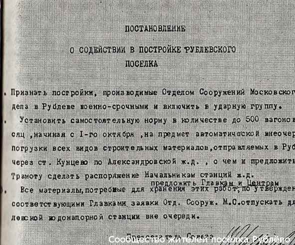 <p "="">Подписанное В.И. Лениным постановление Совета труда и обороны об объявлении строительства в Рублёве военно-срочными и включении его в ударную группу.