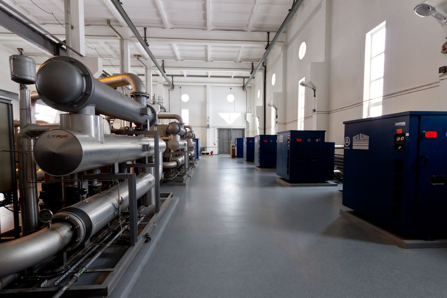 Для получения озона используется следующий техпроцесс: воздух с помощью компрессоров(справа на фото) нагнетается под давлением и попадает в охладители(слева на фото).
